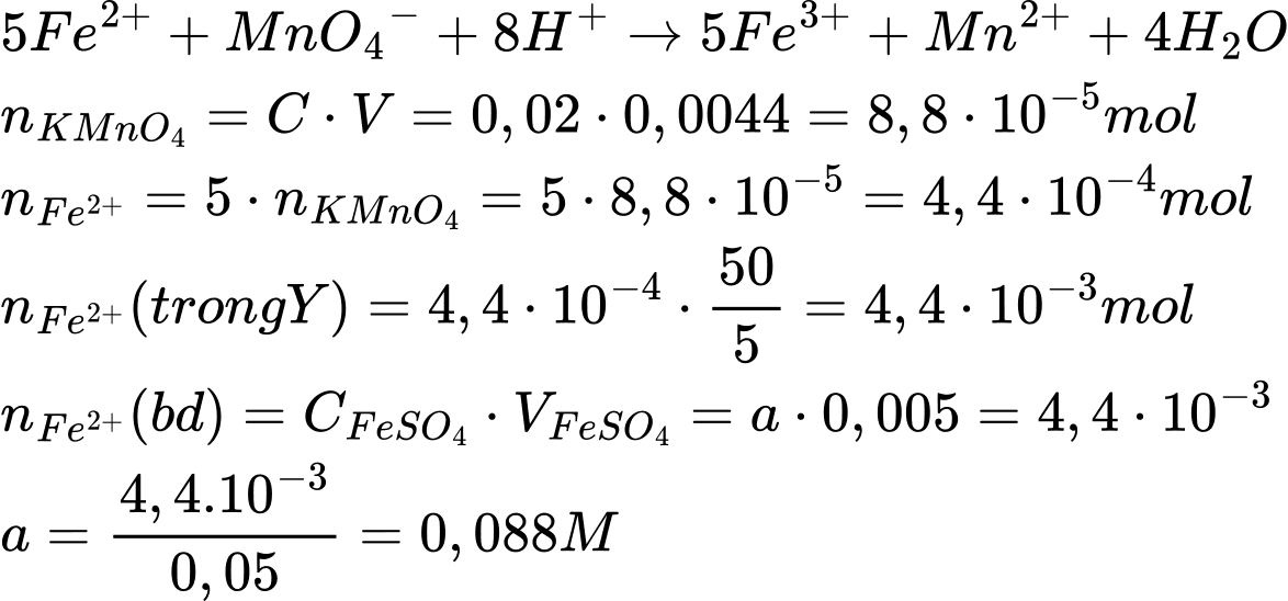 Phương trình phản ứng chuẩn độ đúng giữa ion Fe2+ và KMnO4 là: