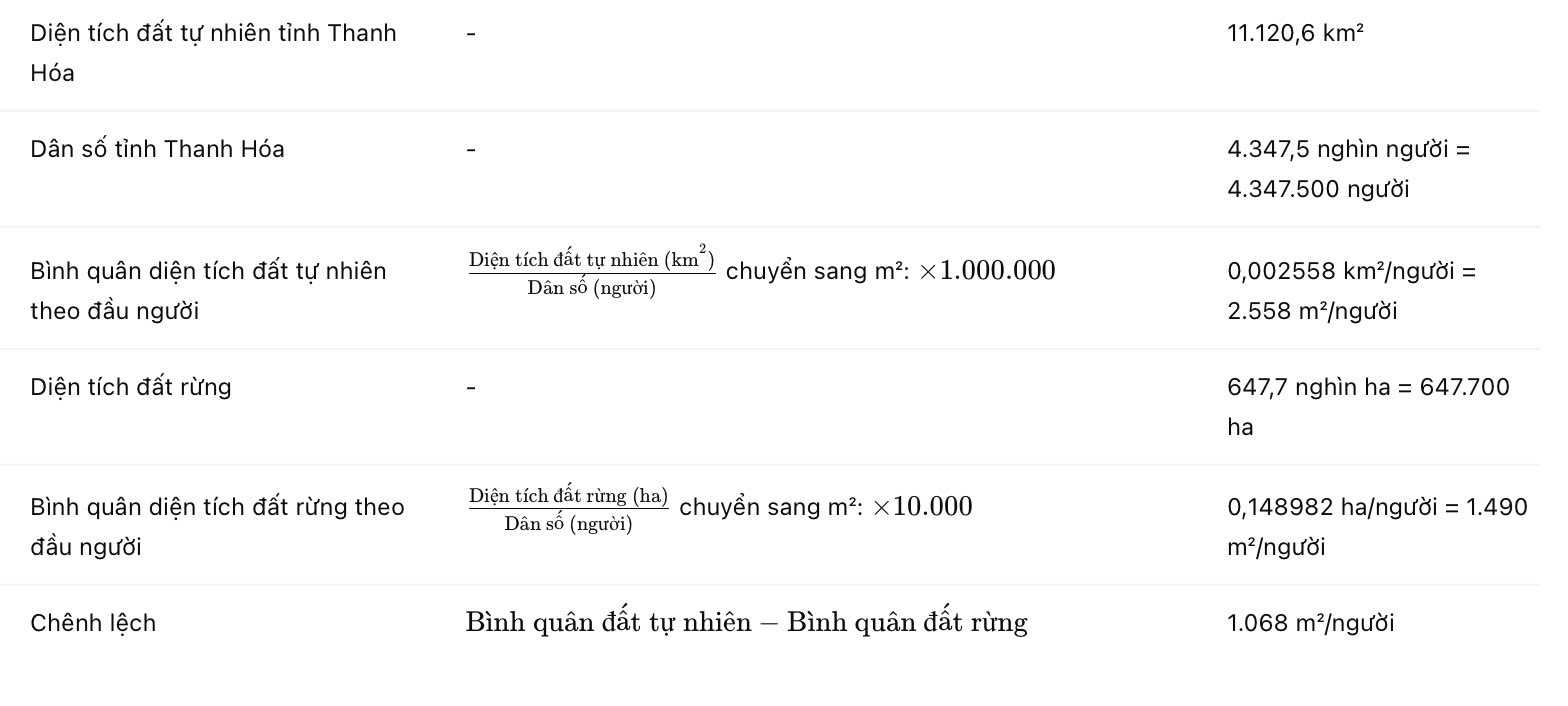 Câu 23 [707718]: Theo thống kê, năm 2022 tỉnh Thanh Hóa có diện tích đất tự nhiên là 11120,6 km2, diện tích rừng là 647,7 nghìn ha, quy mô dân số của tỉnh là 4347,5 nghìn người. Hãy cho biết bình quân diện tích đất tự nhiên theo đầu người lớn hơn bình quân diện tích đất rừng theo đầu người của tỉnh Thanh Hóa là bao nhiêu m2/người (làm tròn kết quả đến hàng đơn vị)?
