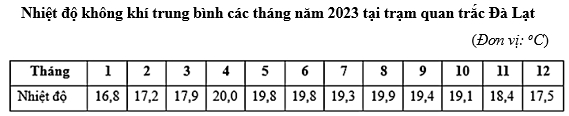Căn cứ vào bảng số liệu trên, hãy cho biết nhiệt độ không khí trung bình năm 2023 tại Đà Lạt là bao nhiêu °C? (làm tròn kết quả đến một chữ số thập phân).