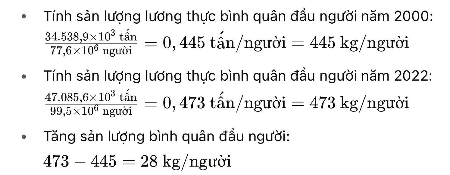 Câu 27 [708103]: Năm 2000, số dân nước ta là 77,6 triệu người, sản lượng lương thực có hạt là 34538,9 nghìn tấn. Năm 2022, quy mô dân số là 99,5 triệu người, sản lượng lương thực có hạt là 47085,6 nghìn tấn. Hãy cho biết sản lượng lương thực có hạt bình quân đầu người của nước ta năm 2022 tăng bao nhiêu kg/ người so với năm 2000? (làm tròn kết quả đến hàng đơn vị).