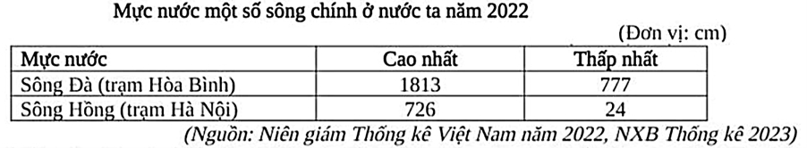 Căn cứ vào bảng số liệu trên, hãy cho biết năm 2022, sự chênh lệch mực nước cao nhất và mực nước thấp nhất của sông Đà tại trạm Hòa Bình cao hơn so với sự chênh lệch mực nước cao nhất và mực nước thấp nhất của sông Hồng tại trạm Hà Nội là bao nhiêu cm.