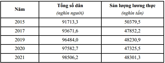 Số dân và sản lượng lương thực của nước ta, giai đoạn 2015 - 2021