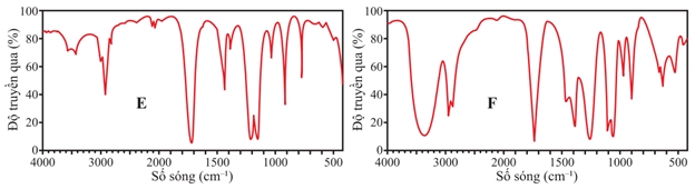 Cho hai chất hữu cơ mạch hở E, F có cùng thành phần nguyên tố: 40,00% C; 6,67% H và 53,33% O về khối lượng. Trên phổ MS, peak ion phân tử của E và F đều nhỏ hơn 100. Cho phổ IR của E và F: