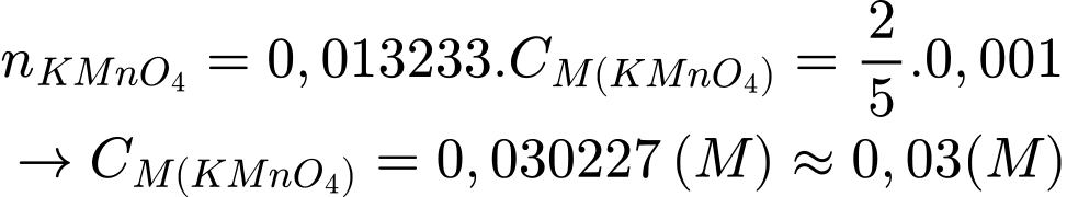 Tính nồng độ (M) của dung dịch KMnO4 được pha sẵn (làm tròn đến hàng phần trăm).