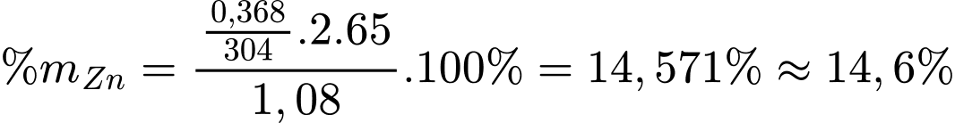 Câu 24 [703996]: Một loại bột khử mùi chân có chứa kẽm. Kẽm trong mẫu bột được kết tủa thành muối kép, ZnNH4PO4. Nung nóng 1,080 gam muối này, tạo ra 0,368 gam Zn2P2O7. Tính phần trăm theo khối lượng kẽm trong bột khử mùi chân (làm tròn đến hàng phần mười).