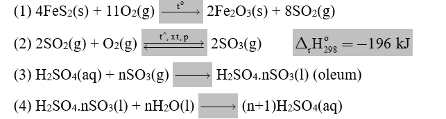 Dùng sulfuric acid 98% hấp thụ SO3(g) trong giai đoạn (3), quá trình này được thực hiện trong tháp tiếp xúc. Để xác định công thức của oleum thu được, người ta pha loãng 8,36 gam oleum vào nước thành 1,0 lít dung dịch sulfuric acid, sau đó tiến hành chuẩn độ 10,00 mL dung dịch acid này bằng dung dịch chuẩn NaOH 0,10 M. Thể tích NaOH trung bình cần sử dụng để chuẩn độ là 20,00 mL.
