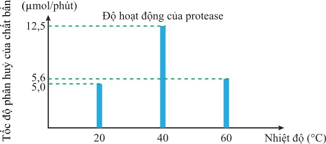 Câu 11 [1105712]: Enzyme là một chất thiết yếu của các chất giặt rửa cao cấp và việc sử dụng chúng mang lại cho người tiêu dùng những lợi ích rõ rệt. Những lợi ích này bao gồm khả năng làm việc ở nhiệt độ thấp, tiết kiệm nước, đồng thời loại bỏ nhu cầu sử dụng các hóa chất khắc nghiệt, gây tác động tiêu cực đến môi trường. Ngoài ra, enzyme có thể phân hủy sinh học nên không để lại lượng dư độc hại. Protease là loại enzyme không thể thiếu trong tất cả các loại hóa chất giặt rửa, nhất là bột giặt, do protease thích hợp để loại bỏ các vết bẩn do thức ăn, máu và các dịch trong cơ thể con người khi tiết ra. Để khảo sát độ hoạt động của protease theo nhiệt độ, người ta tiến hành thí nghiệm nghiên cứu tốc độ phân hủy chất bởi protease. Kết quả cho bởi biểu đồ dưới đây:
