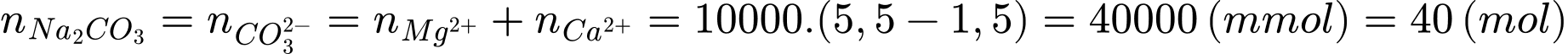 Câu 26 [703976]: Làm mềm 10 m3 nước cứng có tổng nồng độ Mg2+ và Ca2+ là 5,5 mmol/L bằng Na2CO3, thu được nước có tổng nồng độ Mg2+ và Ca2+ là 1,5 mmol/L. Coi toàn bộ lượng Na2CO3 cho vào đều chuyển hết thành kết tủa CaCO3 và MgCO3. Khối lượng Na2CO3 đã dùng là bao nhiêu gam?
