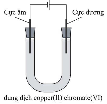 Dòng điện một chiều được truyền qua dung dịch copper(II) chromate(VI) màu xanh lá cây trong thiết bị được minh họa bên. Màu sắc nào sẽ xuất hiện ở mỗi điện cực sau vài phút?