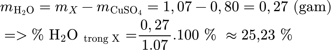 Kết quả thí nghiệm của nhóm học sinh được ghi vào bảng sau. Dựa vào số liệu, nhóm học sinh tính % về khối lượng nước kết tinh có trong X.
