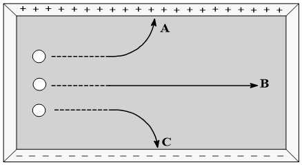 Đề bài yêu cầu xác định hạt electron trong ba hạt A, B, C. Dễ dàng nhận thấy hạt electron mang điện âm thì bị hút về bản dương, vì vậy hạt A là electron. Tương tự ta tìm được hạt C là hạt proton. Hạt còn lại không bị lệch trong điện trường nên là hạt neutron (không mang điện)