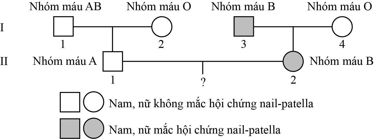 Câu 21 [1101264]: Hình bên thể hiện sự di truyền của 2 tính trạng bao gồm hội chứng nailpatella và hệ nhóm máu ABO ở một gia đình. Gene N gồm 2 allele; trong đó, allele N quy định kiểu hình mắc hội chứng nail-patella, trội hoàn toàn so với allele n quy định kiểu hình không mắc hội chứng này. Gene I gồm 3 allele; trong đó, allele IA và IB ở lần lượt quy định kháng nguyên A và B trên bề mặt hồng cầu, allele IO không quy định kháng nguyên. Allele IA và IB là đồng trội, allele IO là allele lặn. Hai gene (N, I) cùng nằm trên NST số 9 và có tần số hoán vị gene là 10%. Quá trình giảm phân diễn ra bình thường.