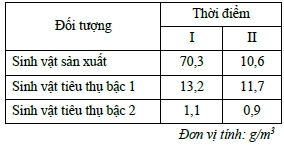 . ❌D. Đúng. Hiệu suất sinh thái ở thời điểm I giữa sinh vật tiêu thụ bậc 2 và bậc 1 là 8,33%. Hiệu suất sinh thái ở thời điểm II giữa sinh vật tiêu thụ bậc 2 và bậc 1 là