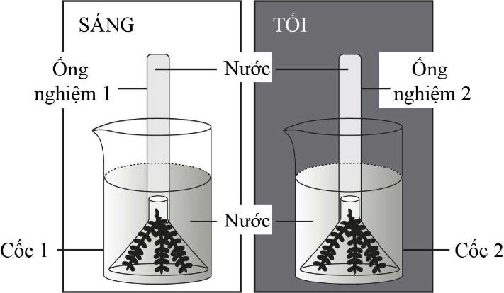 Câu 4 [1101247]: Để thực hiện thí nghiệm về quá trình quang hợp ở thực vật cần chuẩn bị như sau: cành rong đuôi chó, nước, ống nghiệm, phễu thủy tinh, cốc thủy tinh, diêm. Học sinh đã tiến hành thí nghiệm được mô tả ở hình bên: đặt cốc 1 ở ngoài sáng và cốc 2 ở trong tối, với điều kiện nhiệt độ phòng (25 °C - 30 °C); quan sát bọt khí, sự thay đổi mực nước ở 2 ổng nghiệm. Sau 60 phút, ống nghiệm được lấy ra khỏi phễu (đảm bảo nước và khí không bị thoát ra khỏi ống nghiệm) để kiểm tra thành phần bọt khí bằng cách đưa vào miệng mỗi ống nghiệm một que diêm còn tàn lửa và quan sát. Nhận định nào sau đây về kết quả thí nghiệm này là đúng?