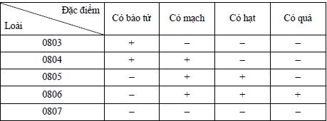 Câu 27 [1101270]: Bảng bên thể hiện sự có (+) hoặc không có (–) một số đặc điểm ở 5 loài (được kí hiệu từ 0803 đến 0807). Loài nào có quan hệ họ hàng gần nhất với loài 0807?