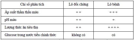 - Lô chuột bị gây bệnh đái tháo đường (Lô bệnh): các chuột được tiêm dung dịch sinh lí cóbổ sung chất làm giảm tín hiệu của hormone insulin với thụ thể trên tế bào đích. Ngay sau khi kết thúc 4 tuần tiêm, chỉ số sinh lí của chuột ở hai lô được phân tích. Kết quả được thể hiện ở bảng bên.