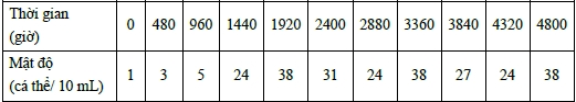 Câu 24 [1101267]: Tiến hành thí nghiệm nuôi một loài động vật thuộc chi Daphnia với mật độ ban đầu là 1 cá thể/10 mL, các nhân tố sinh thái khác tối ưu cho sự sinh trưởng của loài này. Mật độ cá thể ở một số thời điểm thí nghiệm được thể hiện trong bảng sau: