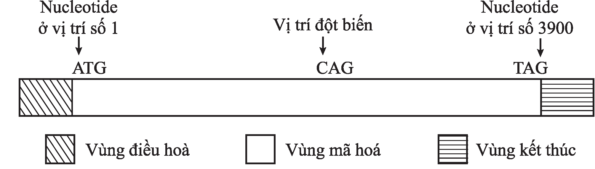 Câu 28 [1101271]: Một gene ở sinh vật nhân sơ có cấu trúc được thể hiện ở hình bên; trong đó, ATG và TAG lần lượt là mã mở đầu và mã kết thúc của gene. Một đột biến thay thế cặp nucleotide làm biến đổi bộ ba CAG thành TAG, dẫn đến xuất hiện mã kết thúc sớm và làm số lượng amino acid của chuỗi polypeptide hoàn chỉnh bị giảm 431 amino acid. Biết rằng, đột biến chỉ xảy ra tại một vị trí duy nhất, amino acid mở đầu (formylmethionine) của chuỗi polypeptide bình thường và chuỗi polypeptide đột biến đều bị cắt khỏi chuỗi sau khi được tổng hợp; quá trình phiên mã và dịch mã diễn ra bình thường. Đột biến xảy ra tại nucleotide ở vị trí số bao nhiêu trong vùng mã hóa của gene (tính từ nucleotide ở vị trí số 1)?