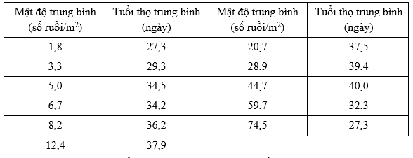 Câu 24 [1099096]: Một thí nghiệm nghiên cứu ảnh hưởng của mật độ ruồi giấm lên tuổi thọ của chúng thu được kết quả như bảng sau: