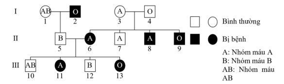 + Do cặp vợ chồng (3) và (4) bình thường và có nhóm lần lượt là nhóm máu A và nhóm máu O nhưng sinh con gái số (6) có nhóm máu A, bị bệnh; con trai (7) có nhóm máu A, bình thường; con trai (8) có nhóm máu A, bình thường; con trai (9) có nhóm máu O, bị bệnh.