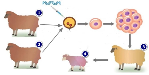 Dựa trên đánh số con cừu trong hình minh họa (theo lý thuyết), con cừu được sinh ra từ cừu mẹ mang thai hộ (số 4) sẽ có gene ngoại lai ở tất cả tế bào.
