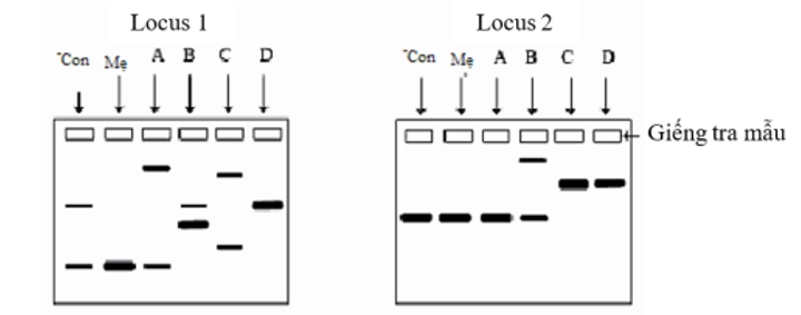 Câu 27 [1099181]: Dưới đây là bản gel điện di các mẫu DNA (ở hai locus thuộc 2 nhiễm sắc thể khác nhau) của một người con, một người mẹ và bốn người đàn ông được nghi là cha của đứa bé (được kí hiệu là 1, 2, 3 và 4).