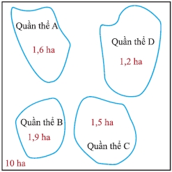 Biết rằng mật độ của 4 quần thể A, B, C, D lần lượt là 300 cây/ha; 660 cây/ha; 200 cây/ha; 600 cây/ha. Tổng số cá thể cây của 4 loài có trong khu phân bố 10 ha là bao nhiêu cây?