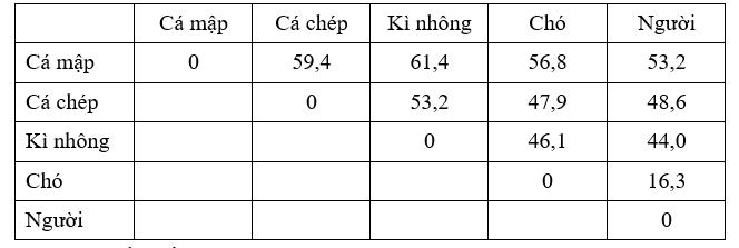 Chó và kì nhông có tỉ lệ sai khác ít nhất (46,1%), chó và cá chép (47,9%), chó và mập (56,8%) → chó và kì nhông có quan hệ họ hàng gần nhau nhất.