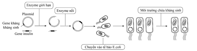 Câu 8 [1100361]: Ở người, hormone insulin có vai trò điều hòa nồng độ đường trong máu. Bệnh nhân mắc tiểu đường do cơ thể không tự sản xuất được insulin cần tiêm insulin ngoại sinh để duy trì nồng độ đường huyết ở mức cân bằng. Hình ảnh dưới đây mô tả tóm tắt quá trình tạo và phân lập dòng vi khuẩn E.coli mang gene quy định insulin của người.