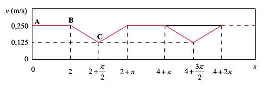 Câu 21 [1042368]: Bộ điều khiển bướm ga điện tử của một mô hình tàu hỏa được lập trình sao cho tốc độ tàu hỏa thay đổi theo vị trí như thể hiện trong sơ đồ. Mô hình đường ray là một hình vuông ở chính giữa và 2 nửa đường tròn ở 2 cạnh đối diện (như hình vẽ). Tốc độ trung bình của con tàu khi đi hết 1 vòng bằng bao nhiêu m/s (làm tròn kết quả đến hàng phần mười)?