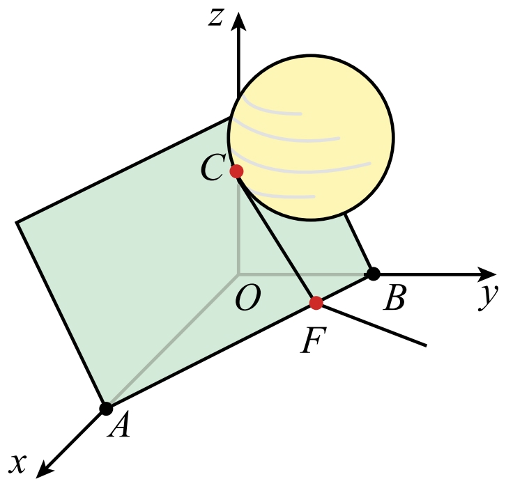 Câu 22 [1095577]: Một nhà sản xuất ổ bi đã đặt một mô hình quả cầu khổng lồ trên mái nghiêng của nhà xưởng. Mặt mái hiên có thể được mô tả bằng mặt phẳng