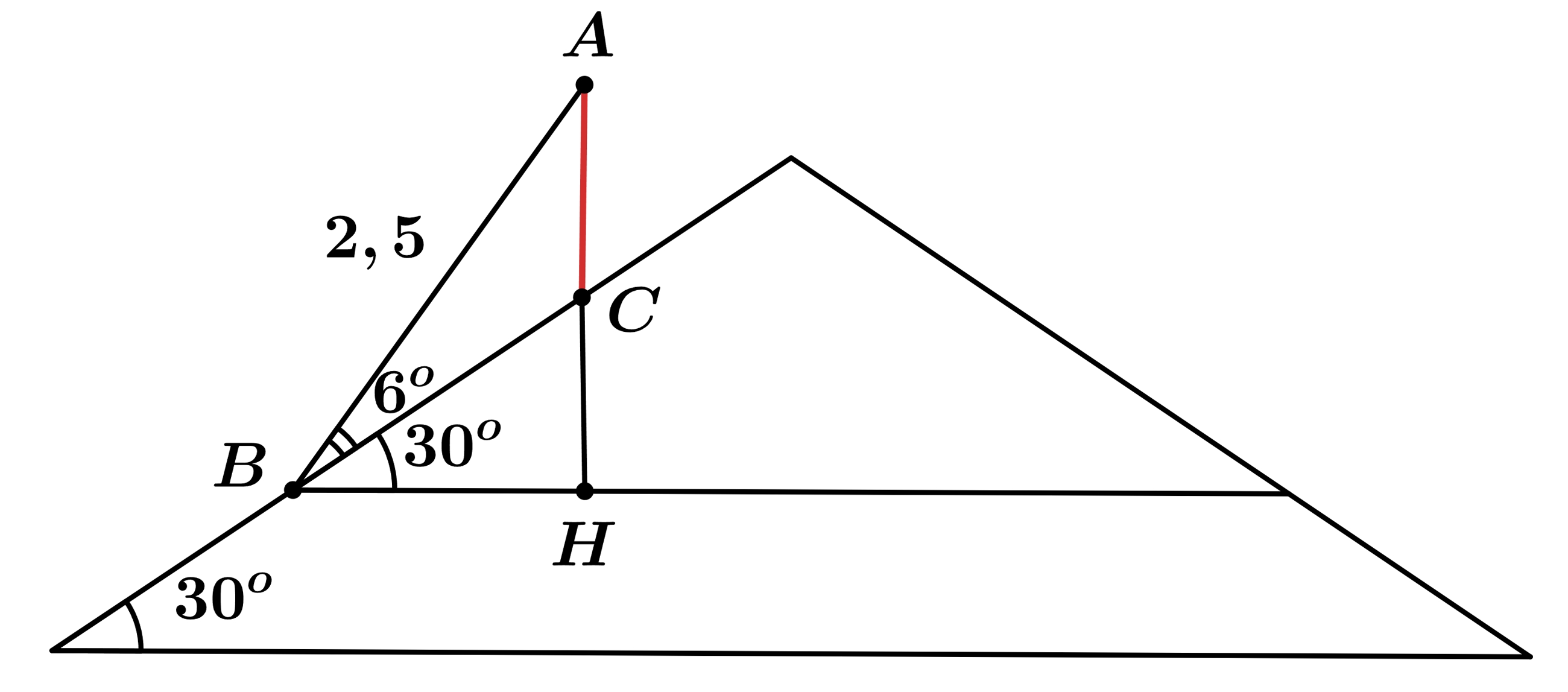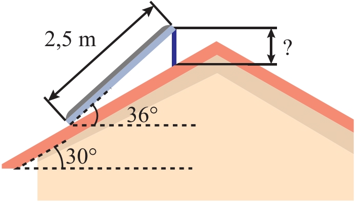 Câu 19 [1092280]: Mái nhà nghiêng một góc 30° so với phương ngang. Một tấm pin năng lượng mặt trời dài 2,5 m được gắn lên mái nhà, tạo với phương ngang một góc 36° như hình vẽ. Đỉnh của tấm pin được cố định với mái bằng một thanh chống kim loại đặt thẳng đứng. Vậy tấm thanh chống dài bao nhiêu centimet (làm tròn kết quả đến hàng phần mười)?