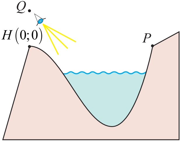 Vậy nhà khoa học cần đặt vị trí camera cách điểm H một khoảng tối thiểu bằng 1,5 mét để có thể ghi lại hình ảnh toàn bộ hồ nước khi cạn.