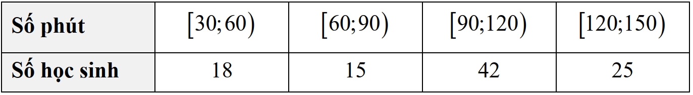 Câu 9 [694283]: Thống kê số phút học bài ở nhà buổi tối của 100 học sinh ta có bảng phân bố tần số ghép nhóm như sau: