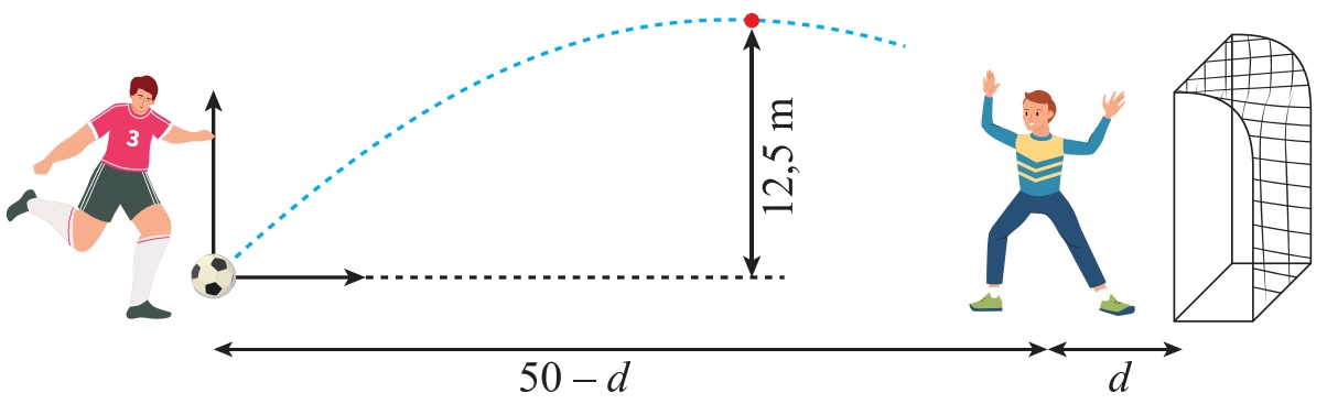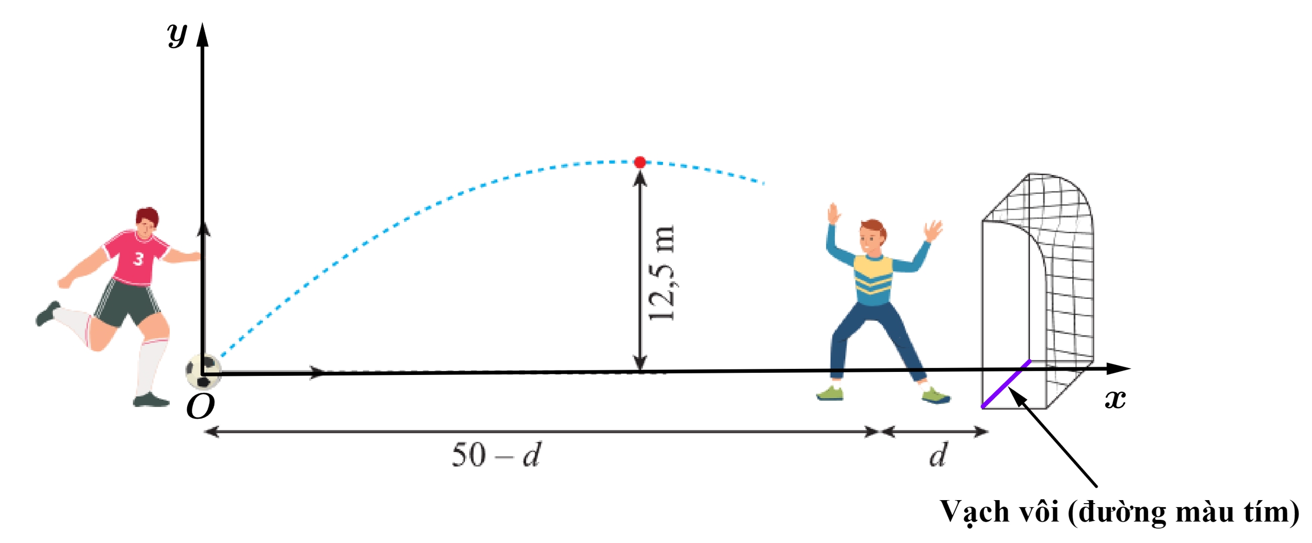 như hình vẽ. Biết quả bóng được sút từ mặt đất và nó đạt chiều cao tối đa là 12,5 mét.