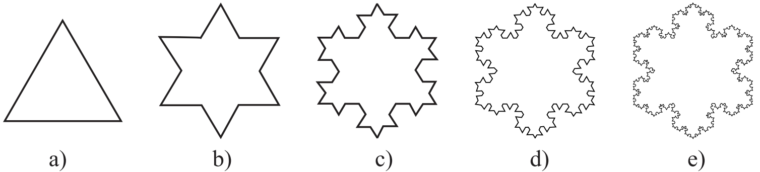 Câu 19 [1099834]: Cho một hình tam giác đều (Hình a). Chia mỗi cạnh của tam giác đó thành 3 đoạn thẳng có độ dài bằng nhau và vẽ một tam giác đều nhận đoạn ở giữa làm cạnh đồng thời bỏ đi đoạn ở giữa đó, ta được Hình b). Tiếp tục chia mỗi cạnh của Hình b) thành 3 đoạn thẳng có độ dài bằng nhau và vẽ một tam tam giác đều nhận đoạn ở giữa làm cạnh đồng thời bỏ đi đoạn ở giữa đó, ta được Hình c). Lặp lại quá trình trên, từ Hình c) ta tạo nên Hình d), từ Hình d), ta tạo nên Hình e), và cứ thế, ta sẽ được một dãy các hình, được gọi là dãy hình bông tuyết Koch.