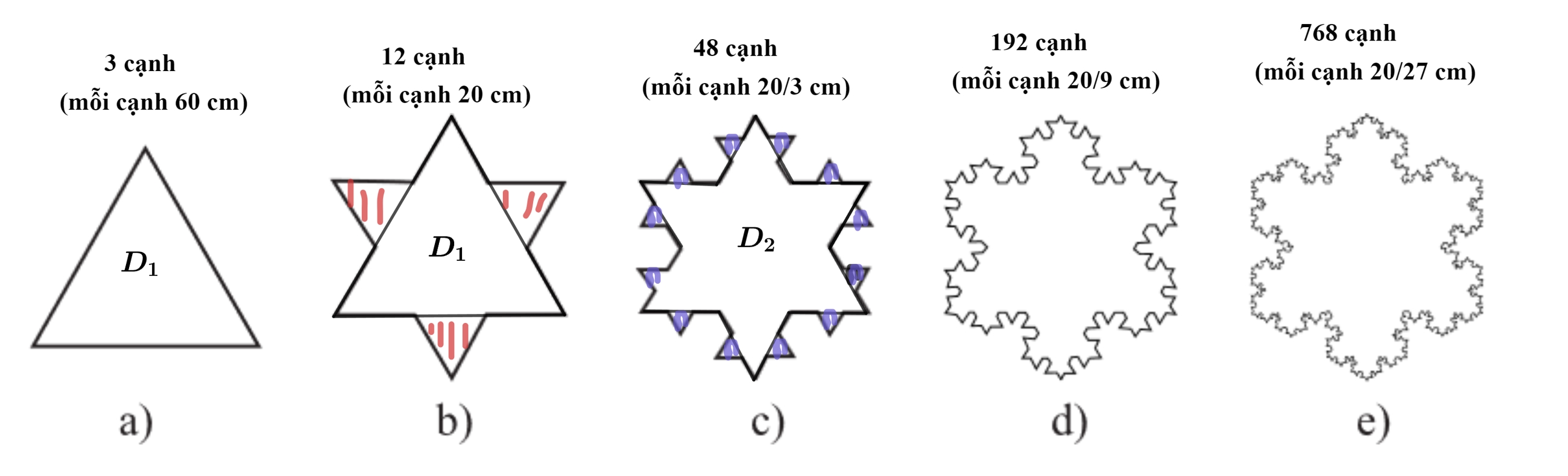 độ dài cạnh ban đầu) hay từ mỗi cạnh ban đầu ta được 4 cạnh mới nên số cạnh của hình sau bằng 4 lần số cạnh của hình ngay trước nó. Suy ra số cạnh của hình a, b, c, d, e lần lượt là 3, 12, 48, 192, 768.