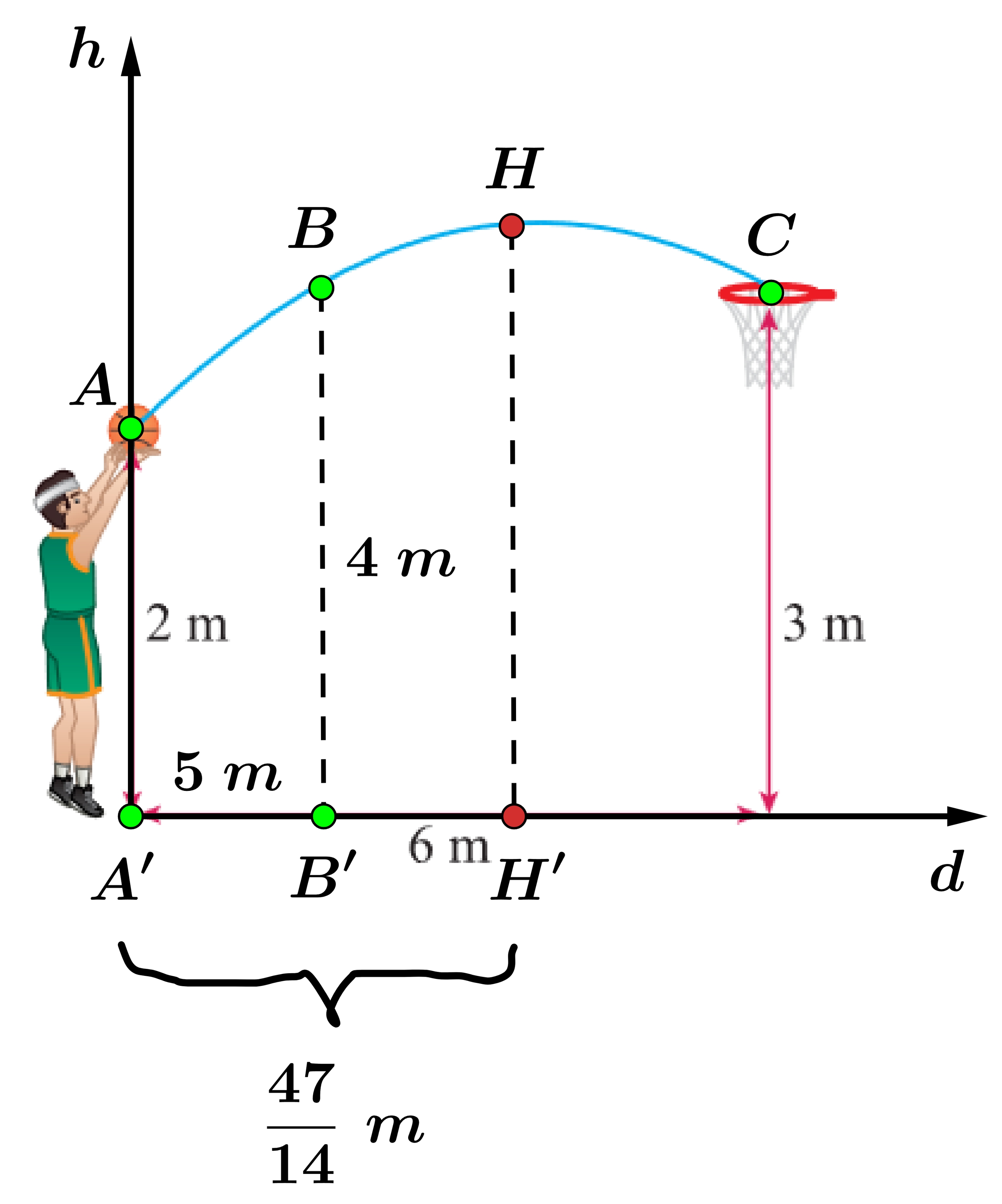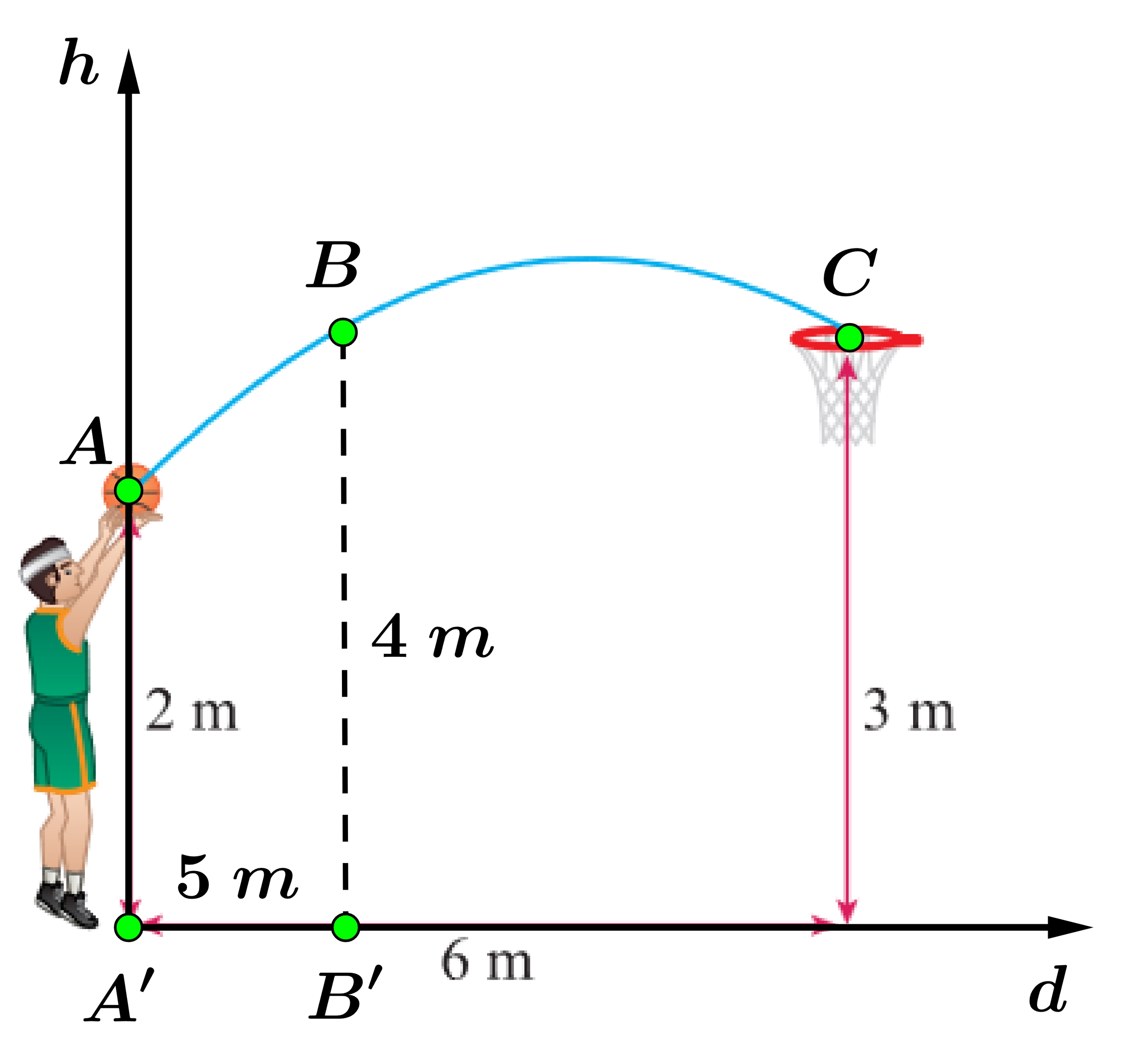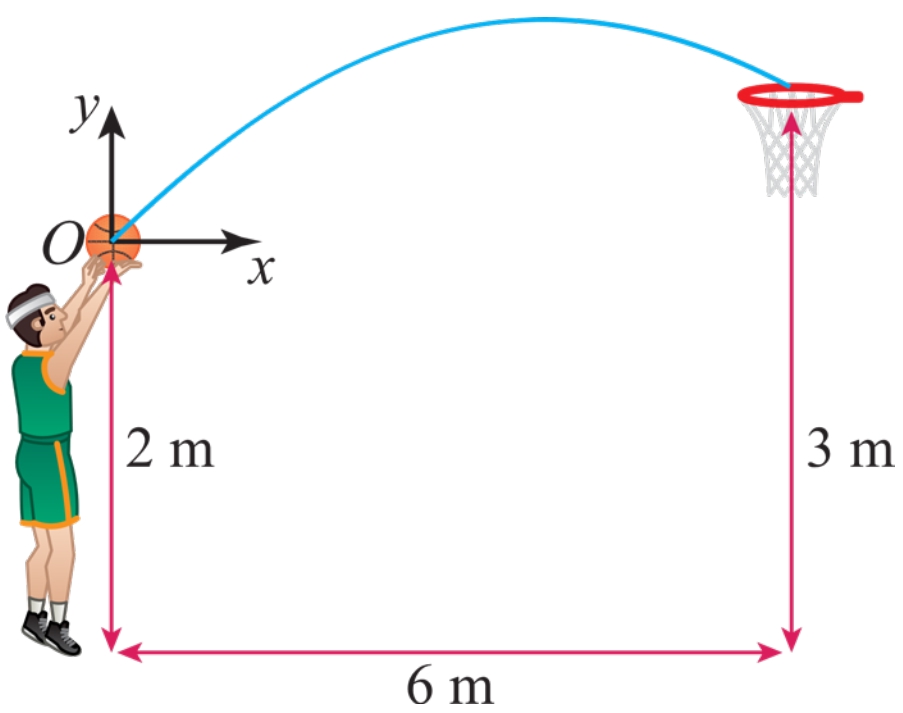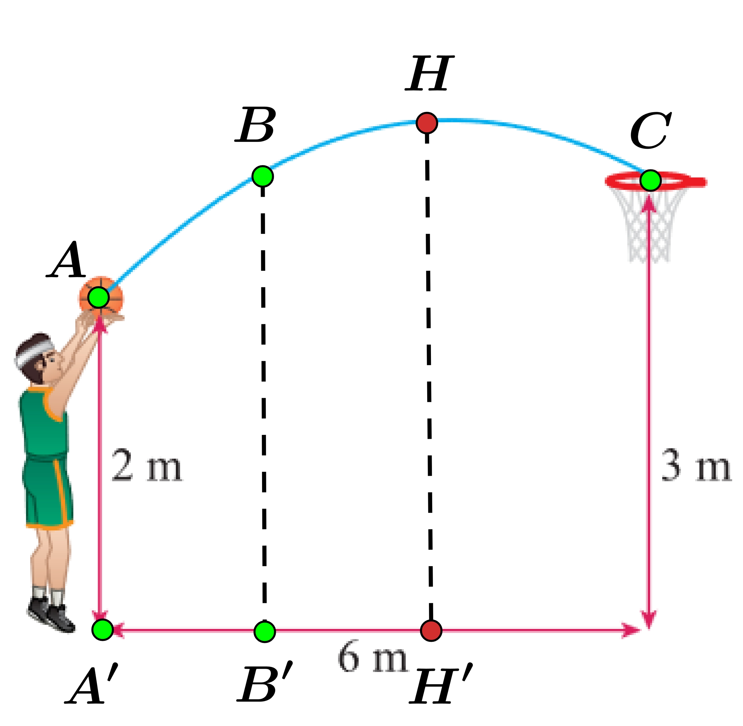 sau đó bay vào tâm của rổ. Biết quỹ đạo của quả bóng là một Parabol nằm trong mặt phẳng vuông góc với mặt sân, khoảng cách từ vị trí ném đến rổ theo phương ngang là 6 mét và tâm của rổ cao 3 mét so với sân. Gọi