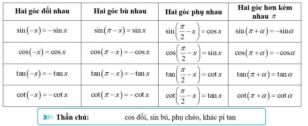 Các khẳng định trên liên quan đến quan hệ giữa hai góc đối nhau. Ta có bảng sau thể hiện mối quan hệ giữa các góc đặc biệt: