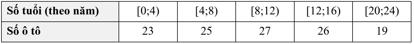 Câu 6 [547579]: Một cuộc khảo sát đã tiến hành xác định tuổi (theo năm) của 120 chiếc ô tô. Kết quả điều tra được cho trong bảng sau.