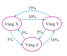 Câu 19 [1041687]: Một khu đô thị lớn có ba vùng dân cư chính: Vùng X, Vùng Y, và Vùng Z. Tổng dân số ban đầu của cả ba vùng là 1 triệu người và không thay đổi trong 1 năm tới. Mỗi năm, một phần dân số sẽ di chuyển giữa các vùng theo các quy tắc sau: