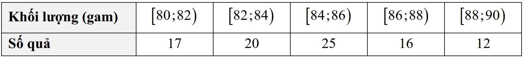Câu 4 [695523]: Bảng sau thống kê khối lượng một số quả măng cụt được lựa chọn ngẫu nhiên trong một thùng hàng.