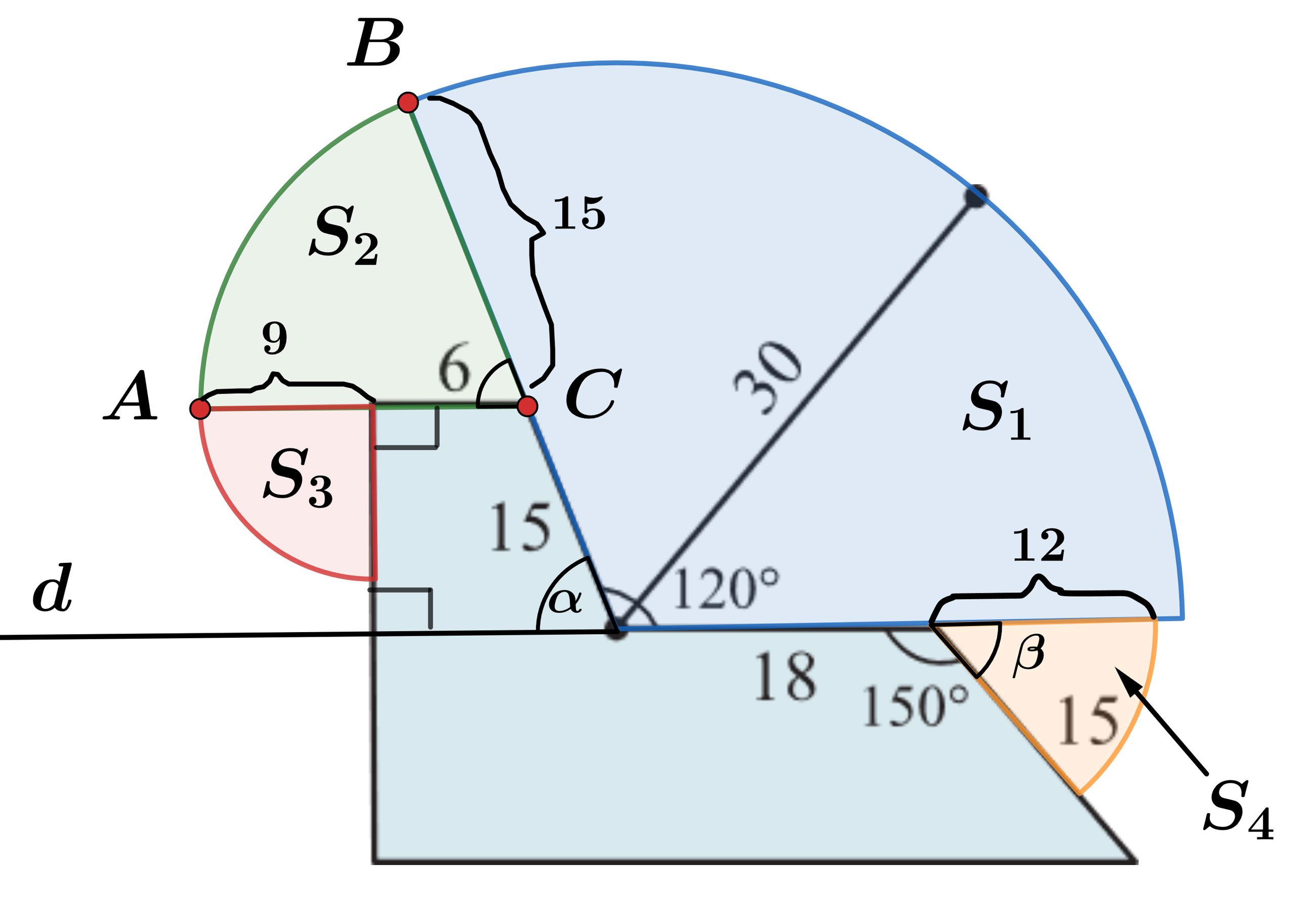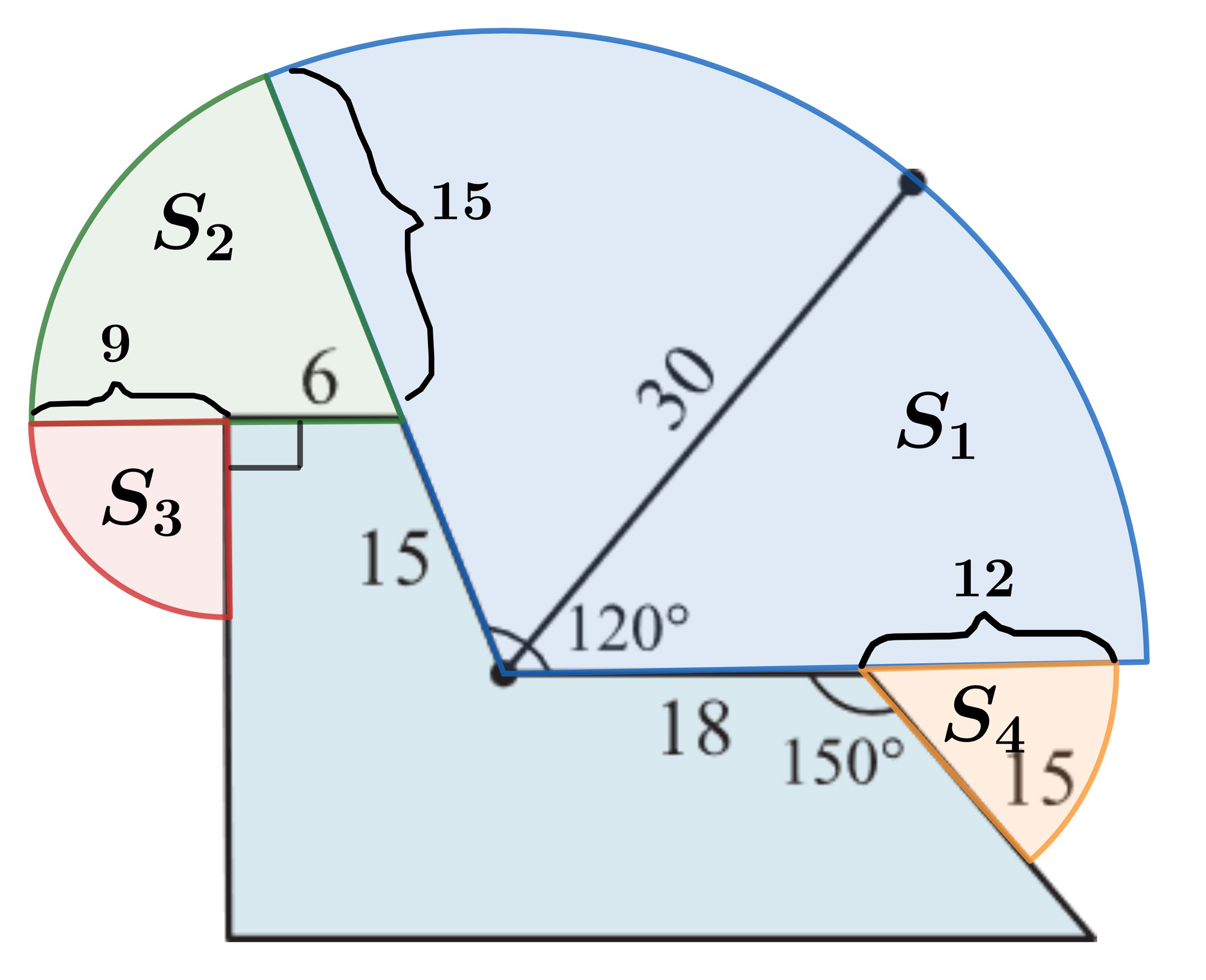 Câu 19 [1103540]: Một tòa nhà ở nông thôn có mặt cắt ngang là một đa giác có 6 cạnh và độ dài các cạnh có kích thước 6 mét, 15 mét, 18 mét và 15 mét (tham khảo hình vẽ). Một con bò bị buộc bằng một sợi dây dài 30 mét vào góc bên trong của tòa nhà. Hãy tìm diện tích tối đa mà con bò có thể gặm cỏ theo đơn vị mét vuông (không làm tròn các phép tính trung gian, làm tròn kết quả cuối cùng đến hàng đơn vị).