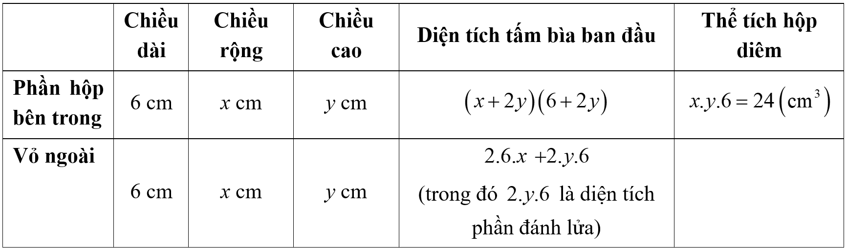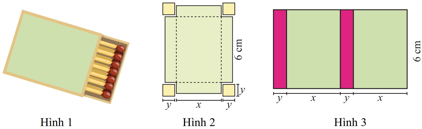 (hình 2). Vỏ ngoài được làm từ một tấm bìa hình chữ nhật thứ hai (với kích thước như hình 3). Biết rằng chi phí vật liệu cho hai mặt bên của vỏ (được dùng làm phần đánh lửa) được tính gấp ba lần chi phí vật liệu còn lại (tính trên cùng một đơn vị diện tích).