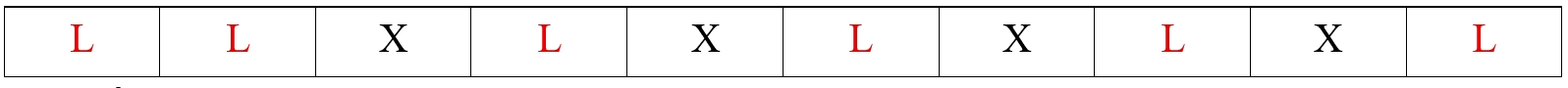 thì con châu chấu phải nhảy lên 6 lần và nhảy xuống 4 lần. Số cách để con châu chấu nhảy lên 6 lần và nhảy xuống 4 lần trong 10 lần bằng với số cách sắp xếp 6 chữ L (nhảy lên) và 4 chữ X (nhảy xuống) vào 10 ô trống: