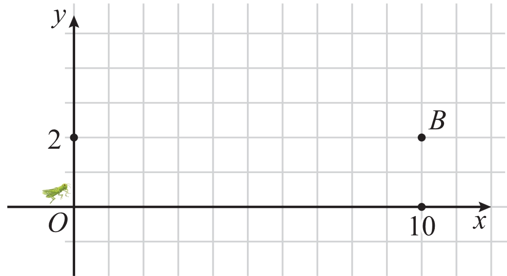 Vì mỗi bước nhảy, con châu chấu nhảy sang phải 1 đơn vị, nên sau 10 bước nhảy con châu chấu sẽ ở điểm có hoành độ bằng 10.