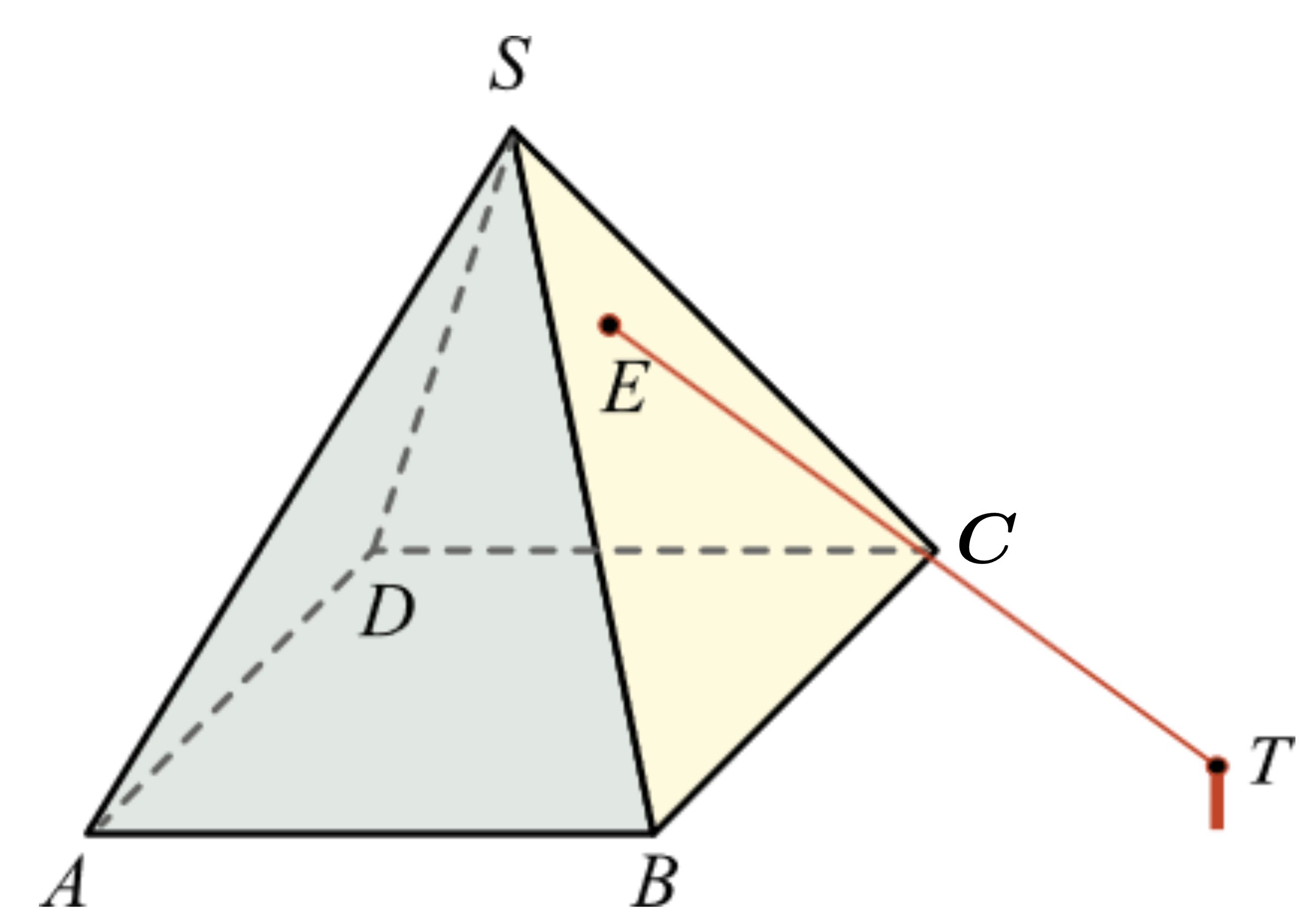 Vì tia sáng chiếu qua lối vào E và đâm xuyên vào kim tự tháp, cắt mặt trong của kim tự tháp tại điểm