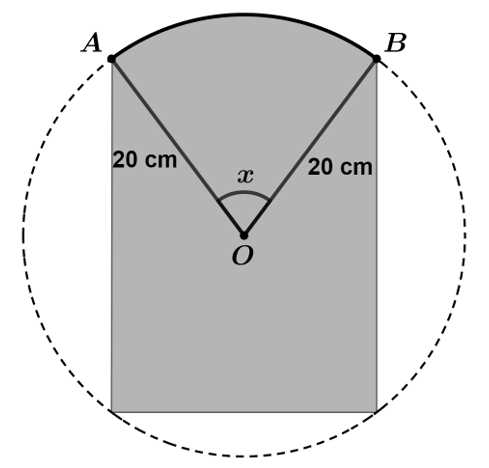 Câu 20 [1012529]: Một miếng thiếc hình tròn có bán kính 20 cm đã bị cắt bỏ 3 phần và để lại miền tô đậm như minh họa. Góc