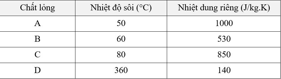 Câu 5 [1106258]: Các khối lượng bằng nhau của bốn chất lỏng khác nhau (A, B, C và D) ở nhiệt độ 20 °C được đun nóng riêng biệt với cùng một tốc độ (công suất). Nhiệt độ sôi và nhiệt dung riêng của chúng được hiển thị trong bảng dưới đây.