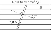 Câu 14 [1106259]: Một dây dẫn thẳng nằm trong mặt phẳng của một từ trường đều như hình vẽ. Cường độ dòng điện chạy trong dây dẫn là 2,0 A và phương pháp tuyến (phương vuông góc) của dây dẫn tạo một góc 20° với từ trường có cảm ứng từ B. Lực từ trên mỗi đơn vị chiều dài tác dụng lên dây dẫn do dòng điện trong từ trường gây ra là 5,5 N/m. Tính giá trị của B.